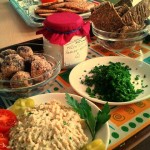 Vas zanima kaj smo pripravili? Kje naj sploh začnemo! Pripravili smo presne ajdove krekerje s korenčkom, čebulo in lanenim semenom, ajdovo-pirine žemlje ter dve vrsti česnovega namaza. Prvi vsebuje česen, skuto, kislo smetano in drobnjak, drugi pa česen, kaljena sončnična semena, hren, peteršilj, čili in limonin sok. To pa še ni vse! Za posladkat smo pripravili še lešnikove kroglice z ajdo, kakavom, borovnicami in medom, za odžejat pa jabolčno-limonino-korenčko